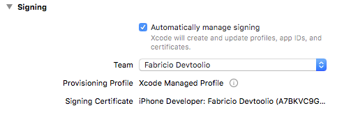 If you are already using match to manage development code signing, Automatic Provisioning will use the match-generated key and certificate. However, Xcode will create and manage its own provisioning profile and will not use the match-generated profile.